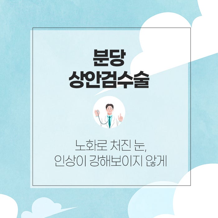 우선 분당상안검수술은 눈꺼풀 처짐 현상과 졸려보이는 눈매를 개선하는데 도움을 주기 위해 피부를 적절하게 절제하고, 눈이 잘 떠질 수 있도록 안검하수를 교정하는 것을 포함한 쌍꺼풀 수술을 말합니다.