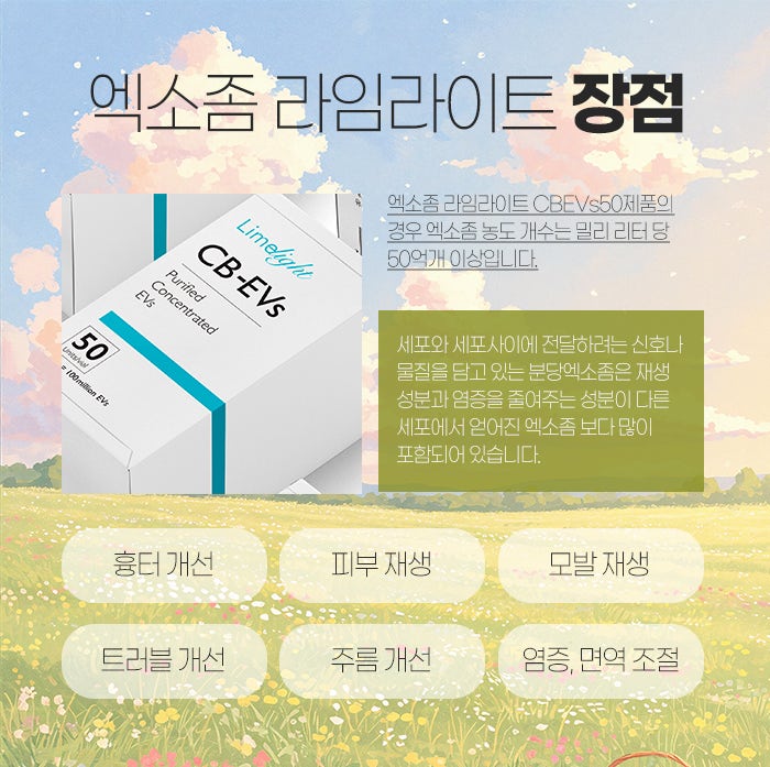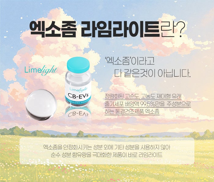 그러한 의미에서 오늘 소개하려고 하는 엑소좀은 바로 라임라이트입니다. 정량화된 고순도, 고농도 제대혈 유래 줄기세포 배양액 99.5%만의 주성분으로 하는 제품인데요. 엑소좀을 안정화시키는 성분 외에도 외에 기타 성분을 사용하지 않아서 순수 성분 함유량을 극대화시킨 제품이라고 말씀드릴 수 있습니다.
