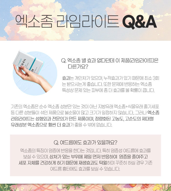 하지만 엑소좀 라임라이트의 경우에는 성형외과 의료진이 만든 제품이기 때문에 정량화된 고순도, 고농도의 제대혈 유래 성분 줄기세포 엑소좀을 사용하고 있어서 보다 좋은 효과를 기대해 볼 수 있습니다.