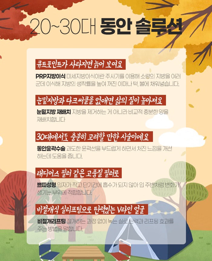 우선 분당미간필러 보톡스는 쁘띠 성형에 해당됩니다. 이러한 쁘띠 성향은 20~30대 동안 솔루션에 해당되는데요. 20~30대 동안 솔루션에는 PRP 지방이식과 눈밑지방재배치, 동안윤곽수술, 비절개 리프팅이 있답니다.