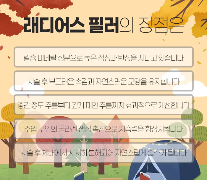 또 칼슘 성분으로 이루어진 만큼 체내에서 분해 속도가 가장 느리며 정성이 뛰어나고, 퍼짐이 없어서 깊게 패인 미간뿐만 아니라 인디언 주름이나 팔자 부위에 생긴 주름을 개선하는 데도 도움을 받아보실 수 있는데요.