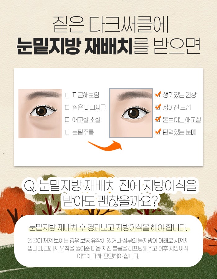 또 눈밑지방 재배치도 경험 많은 분당성형외과 전문의가 있는 곳에서 받도록 해야 하는데요. 특히 근거리로 지방재배치를 하는 곳을 찾게 되면 불거져 나온 눈밑지방이 나아지더라도 꺼진 부위는 제대로 개선되지 않습니다. 그러다 보니 지방이식과 함께 진행하기도 하지만 이런 경우 수술 영역이 겹치게 된답니다.