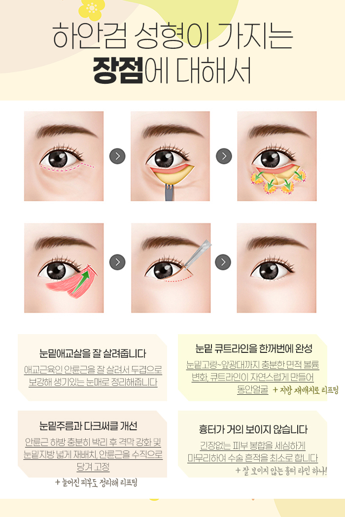 그리고 하안검수술에 대해서도 말해보자면 불룩한 지방은 눈밑고랑 아래로 재배치해서 개선하는데 도움을 주고, 늘어진 안륜근을 리프팅해서 애교살을 좁고 도톰하게 살려주어 인상을 생기 있게 만드는데 도움을 주는 방법입니다.