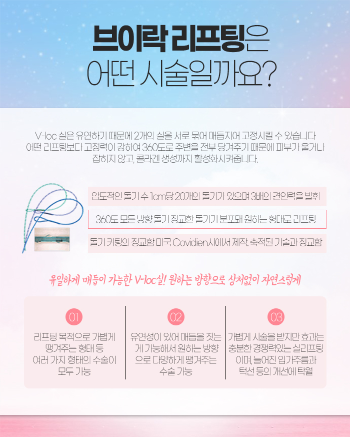 그리고 브이락 리프팅은 유연한 브이락 실을 사용하고 있는데요. 두 개의 실을 서로 묶어 고정시키는 만큼 어떤 리프팅보다 고정력이 강하답니다. 또한 360도로 주변을 전부 당겨주는 만큼 피부가 울거나 잡히지 않고 콜라겐 생성까지 활성화시키는데 도움을 받을 수 있는데요. 가볍게 받을 수 있는 시술이지만 충분히 경쟁력 있는 경쟁력이 있고, 늘어진 입가 주름과 턱선 등에 탁월하게 도움을 준답니다.