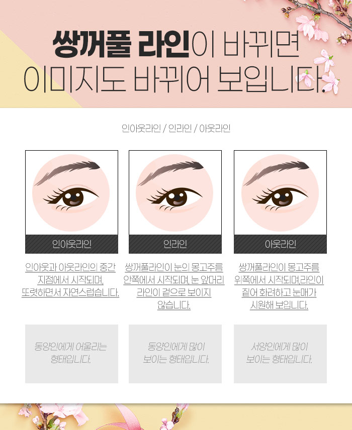 이 외에도 인라인과 아웃라인이 있는데요. 인라인은 눈의 몽고주름 안족에서 시작되는데, 눈 앞머리 라인이 겉으로 보이지 않습니다. 또 아웃라인은 몽고주름 위쪽에서 시작되고 라인이 짙어서 화려하고 눈매가 시원해보이는데요.