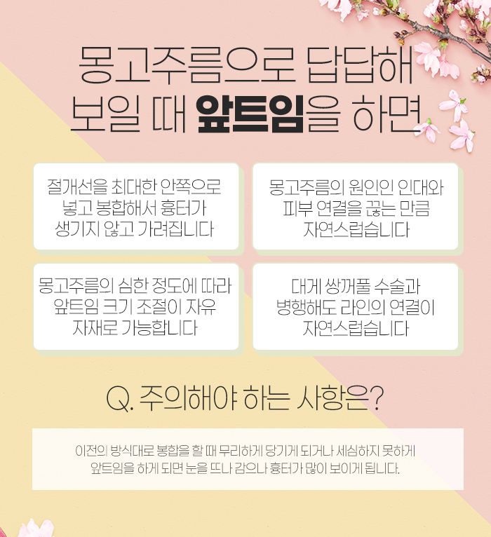 이를 위해 피부와 강하게 유착된 몽고주름을 제대로 풀어주면서 과도하게 트지 않은 상태에서 남는 피부를 알맞게 제거해주어야 한답니다. 또 눈 안쪽에서 쌍꺼풀 라인이 매끄럽게 시작될 수 있도록 쌍꺼풀 라인과 앞트임 절개선을 잘 디자인하여 만나도록 해주어야 합니다. 그리고 절개선이 최대한 눈 안쪽으로 들어가도록 디자인하면서 긴장 없이 피부를 봉합해 흉터를 최소화시키는데 도움을 받아야 합니다.