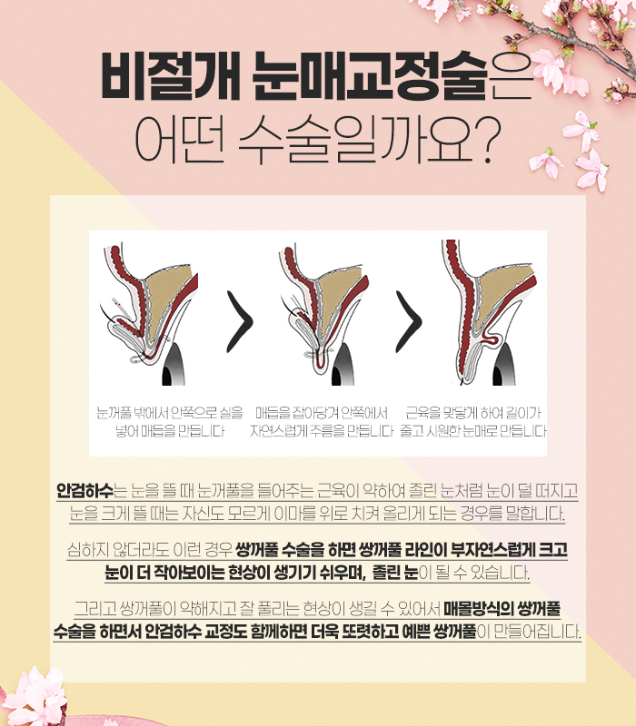 더욱이 쌍꺼풀 수술의 완성도는 인아웃라인 비절개 눈매교정으로 결정되는데요. 이 중 눈매교정에 대해 말해보자면 안검하수를 교정하면서 눈이 커보이게 하는데 도움을 주는 수술이랍니다.