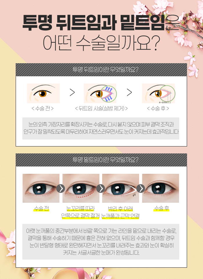 그리고 보다 눈이 커보였으면 하는 마음에 뒤트임 수술과 밑트임 수술을 같이 받으시는 경우도 있는데요. 뒤트임 수술은 눈의 외측 가장자리를 확장시키는 수술입니다. 또 밑트임 수술은 아래 눈꺼풀의 중간 부분에서 바깥 쪽으로 가는 라인을 밑으로 내리는 수술인데요. 뒤트임과 함께할 경우 눈이 반달 형태로 완만해지면서 눈꼬리를 내려주고, 눈이 확실히 커지는 서글서글한 눈매가 된답니다.