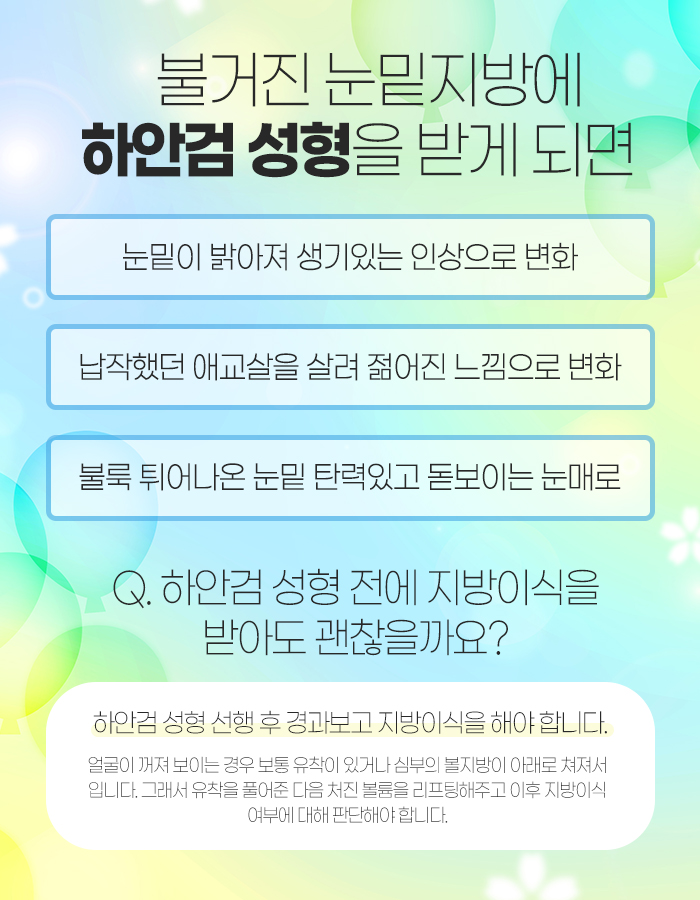 - 눈 아래 꺼풀이 처지면서 아래 눈 부분에 두둑하게 지방이 생겼습니다.