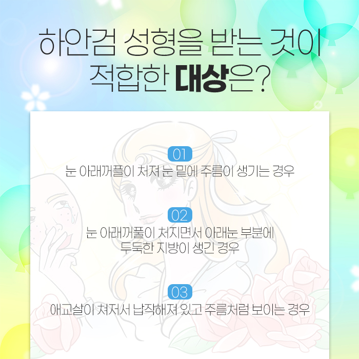 그리고 이러한 하안검수술은 다음과 같은 경우에 받기 적합한 수술인데요.