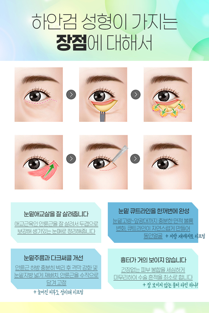 또 수술 경험 많은 의료진이 있는 곳에서 하안검수술을 받게 되면 여려 가지 장점이 있습니다. 우선 눈밑 애교살을 잘 살려줄 수 있는데요. 애교근육인 안륜근을 잘 살려서 두 겹으로 보강하기 때문입니다. 그래서 생기있는 눈매로 정리해줄 수 있답니다.