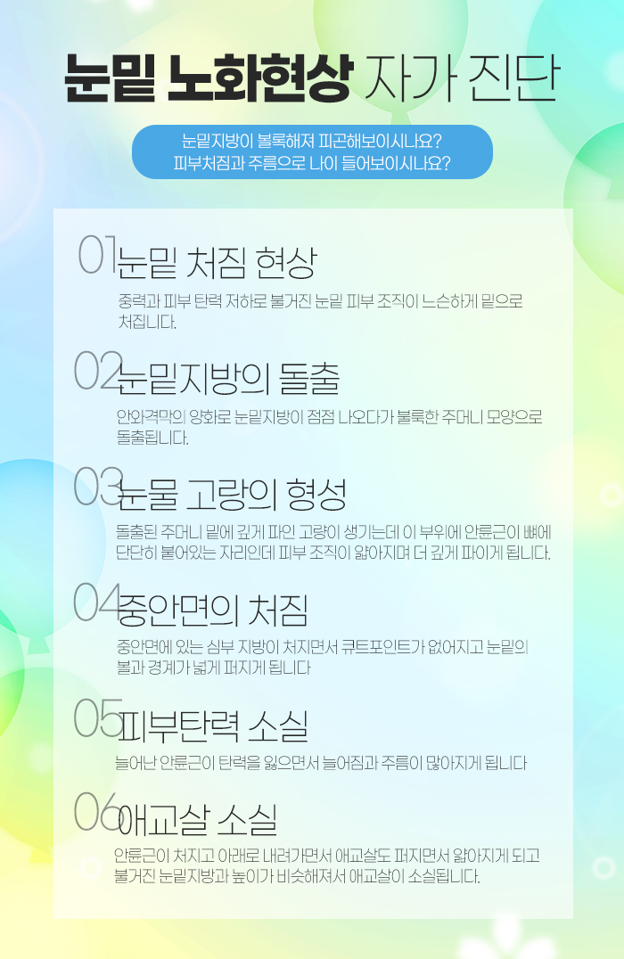 그래서 눈밑이 밝아지게 되고 인상이 생기있어 보이게 되며, 납작했던 애교살을 살려주는 것을 통해 젊어진 느낌으로 변화하는데 도움을 받아보실 수 있습니다. 또 불룩 튀어나온 눈밑을 탄력있고 돋보이는 눈매로 변화시키는 데도 도움을 받아보실 수 있는데요.