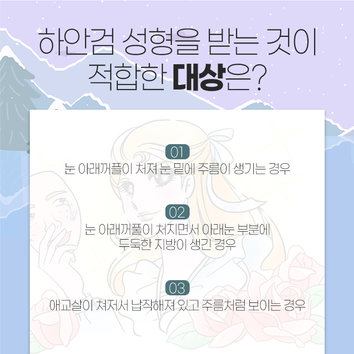 - 눈 아래 꺼풀이 처지면서 아래 눈 부분에 두둑하게 지방이 생겼습니다.