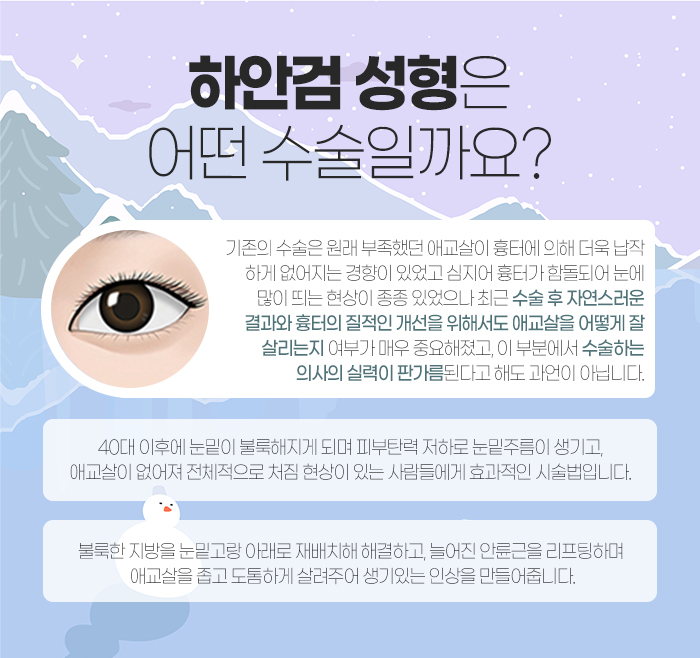 또 분당성형외과흉터를 감안하여 하안검수술을 받으려 하는 눈밑 노화현상으로 눈밑이 처지고 눈밑지방이 불룩 나오면서 중안면 부위에도 영향을 끼쳐 중안면 처짐, 애교살 소실, 피부 탄력 소실 등이 나타나기 때문입니다.