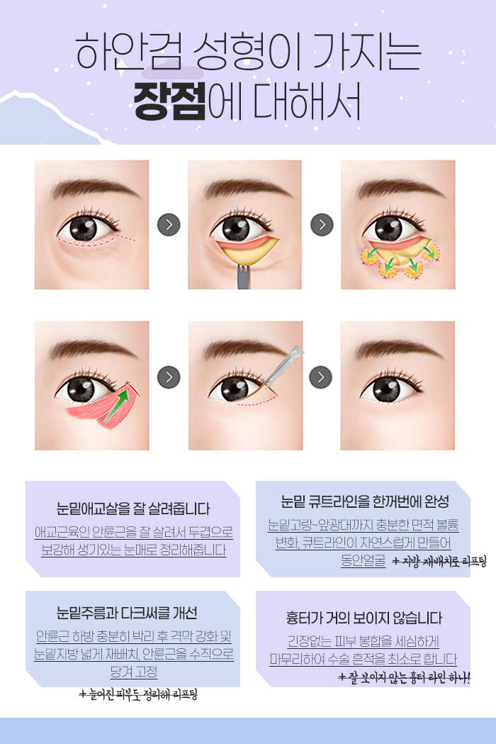 이는 불룩한 지방을 눈밑고랑 아래로 재배치하는 것을 통해 개선하는데 도움을 주고, 늘어진 안륜근을 리프팅해주면서 애교살을 좁고 도톰하게 살려주는 것을 통해 인상을 생기있게 만드는데 도움을 주기 때문입니다.