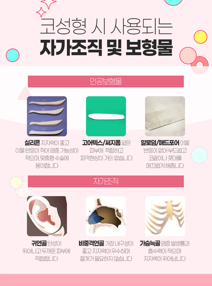 그리고 이러한 자가연골은 귀연골과 늑연골, 비중격연골이 있는데요. 귀연골은 소프트하고 잘 부러진답니다. 또 늑연골은 굵고 단단하기 때문에 코 재건 성형에 적합합니다. 비중격연골은 책받침처럼 얇고 빳빳해서 가공하며 다루기 좋은데요. 콧망울 연골구조를 지지하게 되거나 모양을 변형 및 강화시키는데 적합하답니다.