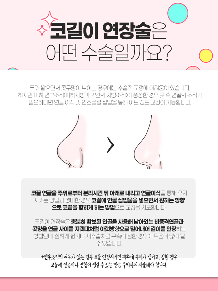즉 코길이 연장술을 진행하게 되면 코끝이 너무 딱딱해지고, 기능적으로도 문제가 있다는 말인데요. 그래서 장말 필요한 경우가 아니고서는 하지 않도록 해야 합니다. 또 자칫할 경우 단단하게 흉터 반응이 많은 고정된 코가 되면서 돌이킬 수 없는 수술한 느낌이 드는 부자연스러운 코가 될 수 있는 만큼 성남성형외과전문의에게 도움을 받는 것이 좋습니다.