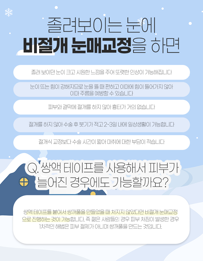 반면 비절개눈매교정은 완전 절개가 아니라도 눈 뜨는 힘이 기대 이상으로 좋아지면서 겉으로 보기에 매몰법처럼 흉터가 거의 보이지 않으며 선명하면서도 또렷한 쌍거풀 라인을 완성한다는 장점이 있습니다. 또 수술 시 유착이 일어나는 만큼 매몰법보다 풀리는 경향이 현저하게 적은데요.
