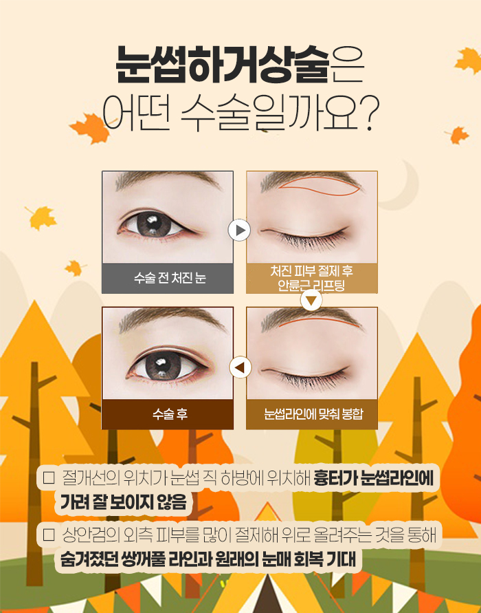 참고로 눈썹하거상술은 상안검 외측 피부를 많이 절제해서 위로 올려주는 것을 통해 숨겨져 있던 쌍꺼풀 라인과 원래의 눈매가 회복되는 것을 기대할 수 있도록 해주는 수술인데요. 절개선의 위치가 눈썹 직하방에 위치하고 있기 때문에 흉터가 눈썹 라인에 가려져서 잘 보이지 않는답니다.