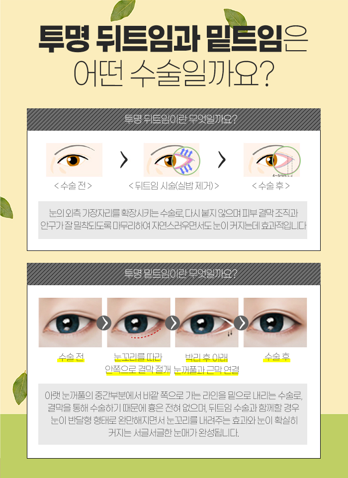 또 분당성형외과에서 뒤트임 수술과 밑트임 수술을 받기 위해 알아보는 경우가 많은데요. 뒤트임 수술은 눈의 가로 길이를 확장하기 위해 눈의 바깥 쪽을 절개해서 눈가의 답답함을 개선하며 눈꼬리가 올라간 느낌 또한 개선하는데 도움을 주는 수술이랍니다.