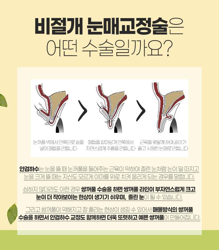 사실 몽고주름 제거술이라는 이름이 더 적합하답니다. 눈 안쪽 깊숙한 속 눈썹 라인을 따라서 0.5~1cm 정도의 절개선으로 피부를 살짝 박리하여 들어올리는데요. 이때 피부와 붙어있는 몽고주름 인대와 안륜근육조직을 분리하면서 다시 내려놓고 봉합하게 된답니다. 그리고 몽고주름의 깊이에 따라서 트는 정도를 조절하는 만큼 과거처럼 무리하게 당겨서 봉합하는 과정이 없는데요.