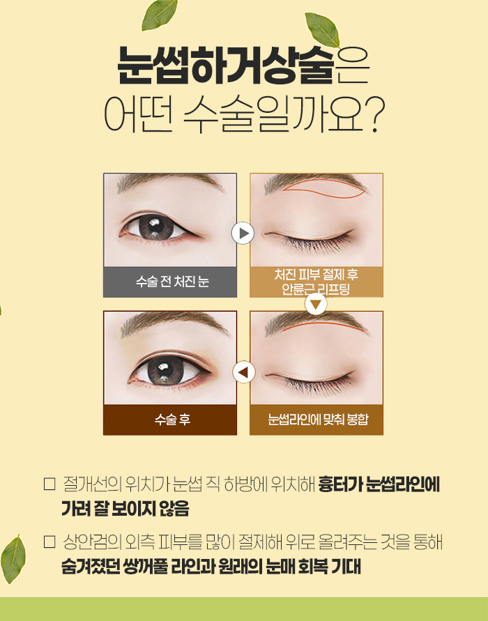 쌍꺼풀이 제 자리에서 잘 접힌다면 처진 피부를 없애거나 눈썹을 리프팅하는 방법으로 대부분 눈처짐 문제는 나아지는데요. 이런 경우 쌍꺼풀 높이 개선과 처진 눈꺼풀 증상을 위해 눈썹하거상술로 도움을 받아보실 수 있습니다. 처진 눈썹을 더 떨어지지 않게 하며 눈썹 라인을 통해 처진 피부를 절제해서 흉터가 잘 안 보이고 자연스럽게 교정하는데 도움을 줍니다.