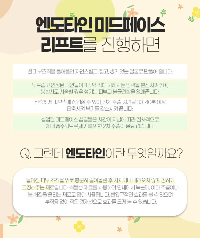 참고로 엔도타인은 늘어진 피부 조직을 충분히 위로 끌어올린 다음 처지거나 내려오지 않도록 강하게 고정해주는 재료를 말한답니다. 식물성 재료를 사용하고 있으며, 인체에 녹는데요. 반영구적이고 이마주름과 볼 처짐을 올리는 용도로 많이 사용됩니다.