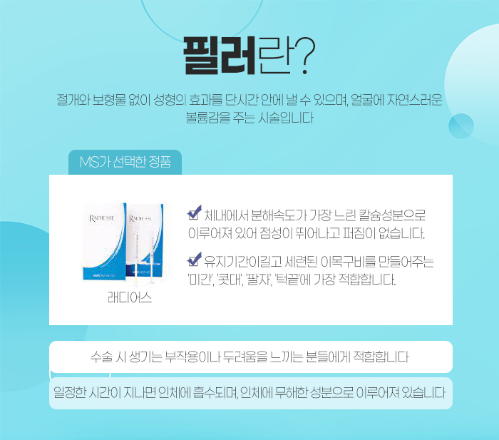 또 필러의 경우 대표적으로 히알루론산 필러인 레스틸렌 필러와 칼슘 필러인 레스틸렌이 있는데요. 분당보톡스 팔자필러의 경우 래디어스를 사용하게 된답니다.