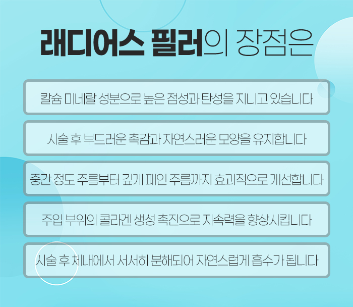 래디어스는 칼슘 필러인 만큼 인체의 뼈 성분과 거의 동일한 순도 높은 칼슘 성분으로 이루어져 있는데요. 미국 FDA에서 승인된 제품으로, 정품이랍니다. 입자가 크고 하드하기 때문에 팔자주름처럼 좁고 굵은 주름은 물론 이마나 미간, 콧대, 턱끝에 볼륨을 보충하기에도 적합한데요. 이는 시술 후 모양 변형이 적다는 특성이 있어서 콧대와 턱끝처럼 골격구조 느낌이 나는 약간 하드한 느낌으로 자연스럽게 진행하기 적합해서입니다.