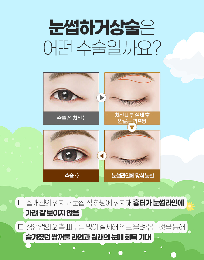 눈썹이 내려와도 눈과 눈섭 사이의 거리가 어느 정도 확보될 수 있다면 기존의 눈매를 변형시키지 않고 처진 피부를 절제하는 눈썹하거상술을 통해 도움을 받을 수 있고, 눈과 눈썹 사이가 너무 가까운 경우에는 주름과 탄력을 자연스럽게 개선하는데 도움을 주는 이마눈썹거상술을 적합니다.