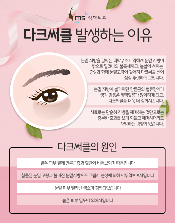 우선 눈밑지방 재배치를 받게 만드는 원인인 다크서클에 대해 이야기를 해보자면 눈밑지방을 감싸고 있는 격막구조가 약해지면서 눈밑지방이 밖으로 밀려나와 불룩해지고 볼살이 처지는 증상과 함께 눈밑고랑이 깊어지게 되면서 점점 뚜렷하게 보이게 된답니다.