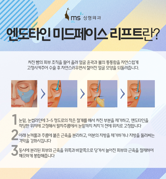 그리고 중안면거상에 대해 얘기해보자면 안면거상술 가격 후기 많은 분당 ms성형외과에서는 엔도타인 미드페이스 리프트를 통해 도움을 드리고 있는데요. 처진 뺨의 피부 조직을 들어 올려서 얼굴의 윤곽과 볼의 퉁퉁함을 자연스럽게 고정시켜주는 것을 통해 자연스러우면서도 젊어진 얼굴 모양으로 되돌리는데 도움을 주는 수술이랍니다.