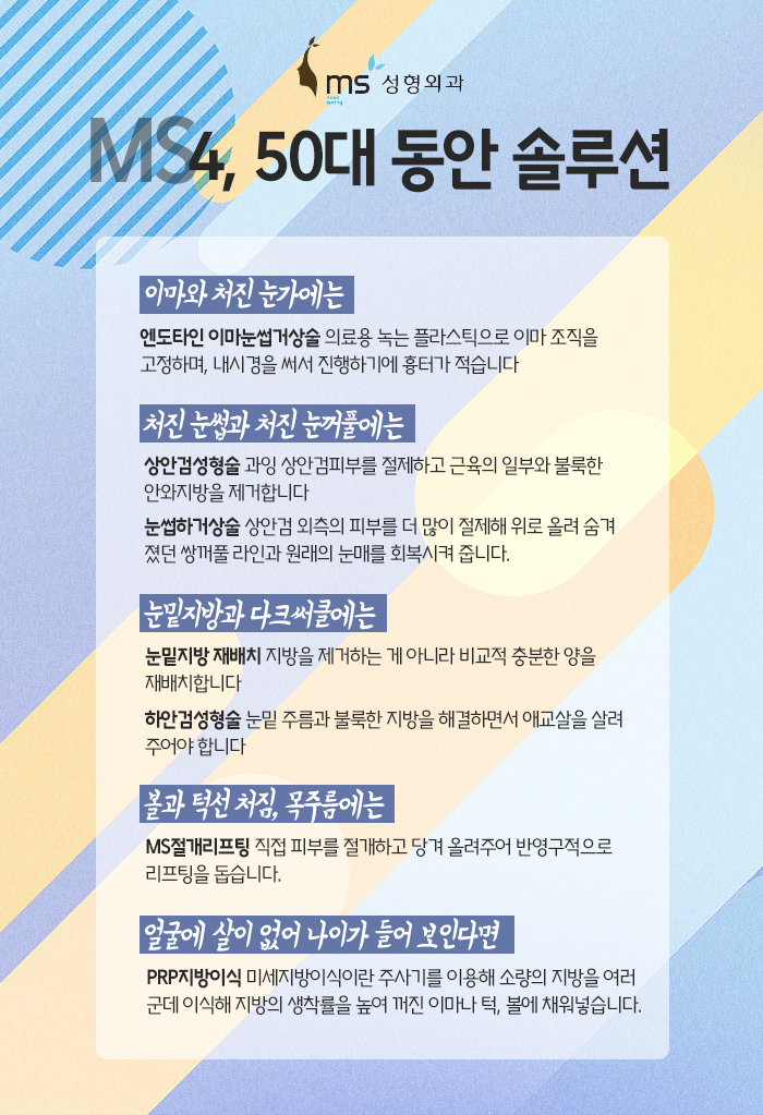 그리고 이러한 안면거상술은 40~50대 동안 솔루션에 해당되는데요. 여기에는 엔도타인 이마눈썹거상술과 상안검성형, 눈썹하거상술, 눈밑지방 재배치, 하안검성형, 절개리프팅, PRP 지방이식 등이 있습니다.