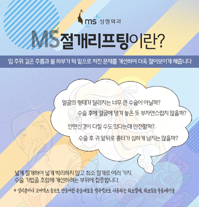 안면거상술 가격 후기에 대해 알아보며 고심하시는 분들이 많습니다. 그 이유는 안면거상을 받아도 인디언 주름 등이 제대로 개선되지 않는 등의 문제가 발생하는 경우가 보여서인데요. 그래서 안면거상술 가격 후기에 대해 알아보시는 분들이 많은 분당 ms성형외과에서는 이러한 안면거상술에 대해 말씀드리는 시간을 가져보려고 합니다.