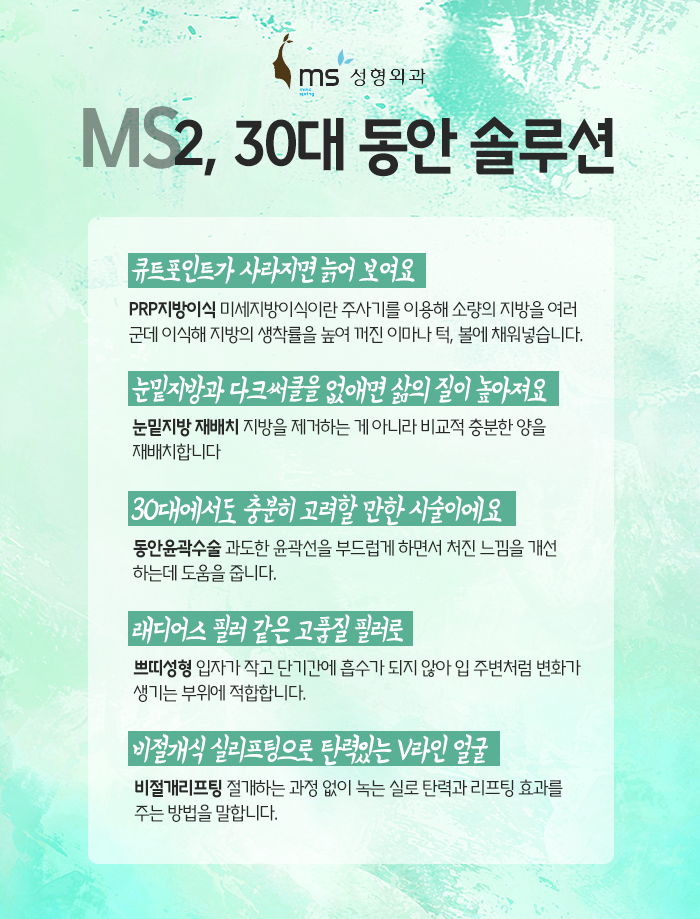 그래서 분당 ms성형외과로 내원해주시면 이처럼 앵커 포인트가 있는 다이아몬드 리프팅과 브이락 리프팅을 시술 받으실 수 있는데, 또 이 둘을 조합하여 시너지 효과가 나타나는 것을 기대할 수 있는 MVP 리프팅 또한 받아보실 수 있답니다. 이로 하여금 얼굴 타입에 따라서 턱선부터 늘어진 목선까지 리프팅하는데 도움을 받아보실 수 있습니다.