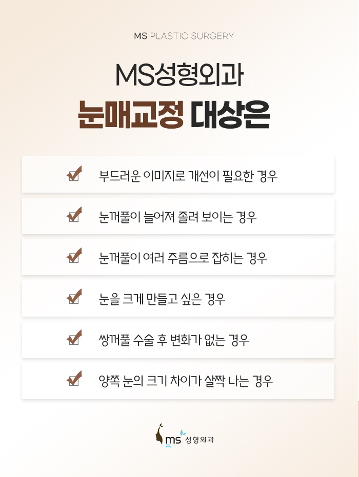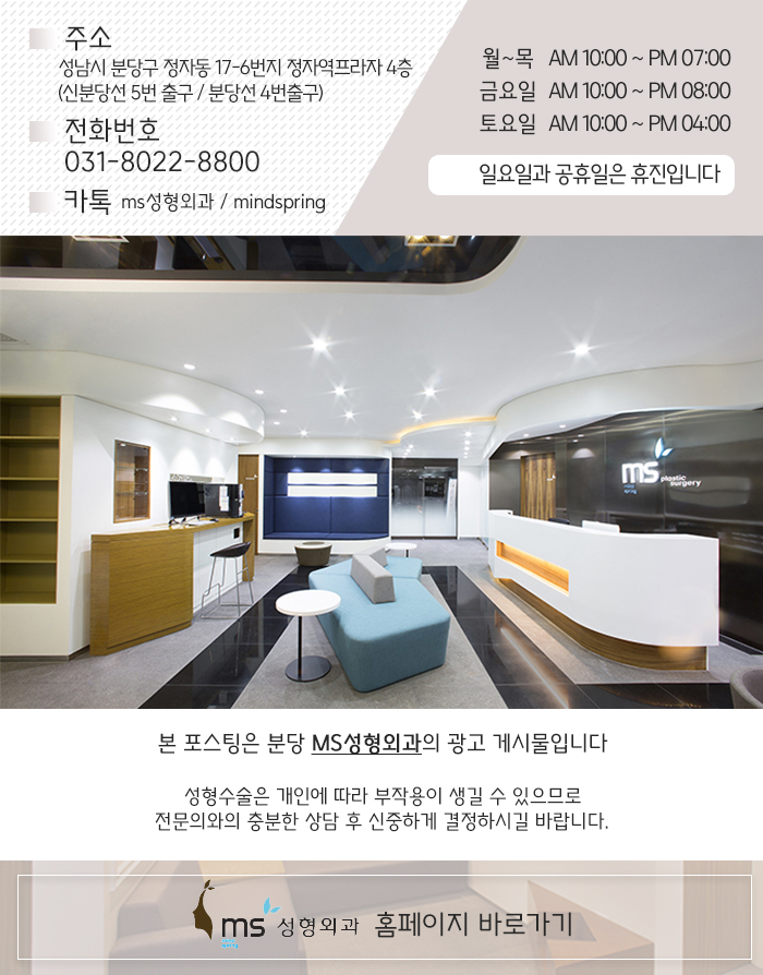 이 외에도 눈썹이 너무 처져 있거나 눈꺼풀이 많이 처져서 쌍거풀 라인이 드러나지 않는다면 인상 변화 문제가 가장 중요한데요. 이런 경우 엔도타인 이마거상술로 도움을 받아보실 수 있습니다. 그러니 눈재수술로 고민을 하고 있다면 쌍커플재수술잘하는병원인 분당 ms성형외과를 찾아주시기 바랍니다.
