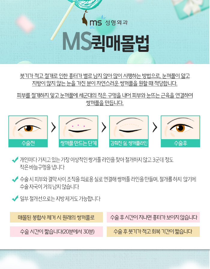 쌍수매몰풀림 등의 문제가 생기게 될가봐 걱정을 하시는 분들이 많습니다. 그래서 비절개식으로 쌍꺼풀 수술을 진행하고자 하시는 분들이 쌍수매몰풀림 문제가 있다 보니 매몰법 보다는 비절개 눈매교정을 주목하시는 경우가 많고, 또 문의주시는 경우가 많은데요. 그런 만큼 오늘 분당 ms성형외과에서는 이에 대해 이야기하는 시간을 가져보려고 합니다.