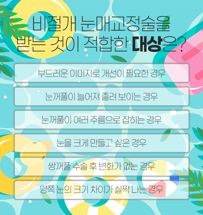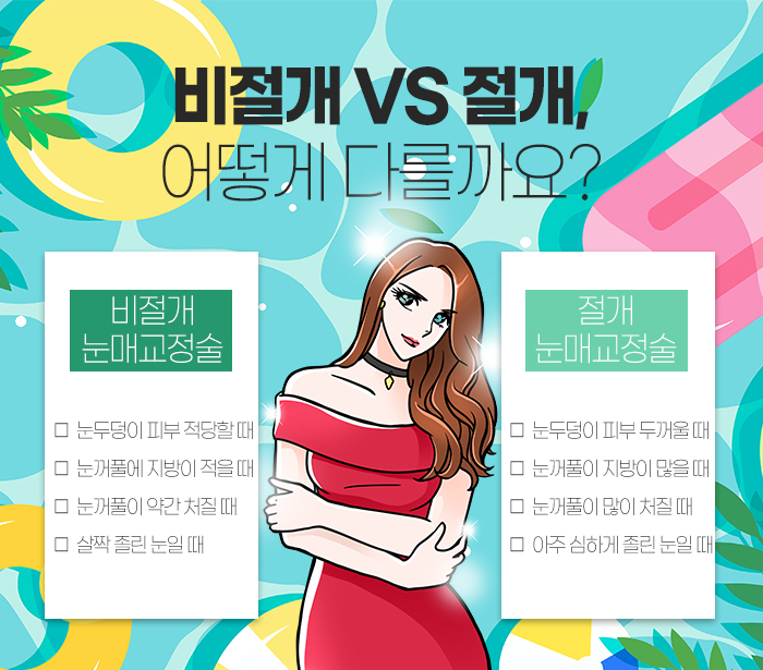 그래서 비절개 눈매교정술을 선호하시는 경우가 더 많지만 모두 비절개로 진행할 수 있는 것은 아니랍니다. 눈두덩이의 피부 두께, 눈꺼풀의 지방량, 눈꺼풀이 처짐 정도, 안검하수의 정도 등에 따라서 달라지게 된답니다.