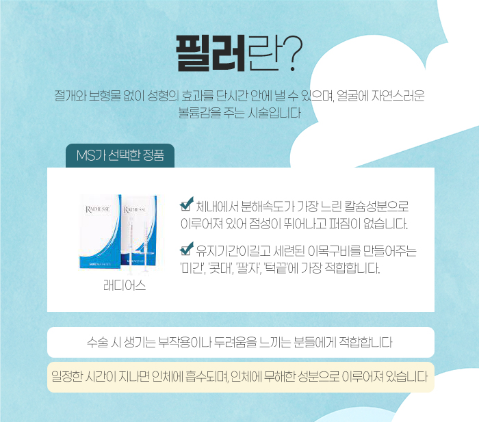 이 중 칼슘 필러인 래디어스 필러에 대해 얘기하자면 체내에서 분해속도가 가장 느린 칼슘 성분으로 이루어져 있기 때문에 점성이 뛰어나며 퍼짐이 없답니다. 또 유지기간이 길고 미간과 콧대, 팔자, 턱끝에 시술 받기 적합한데요.