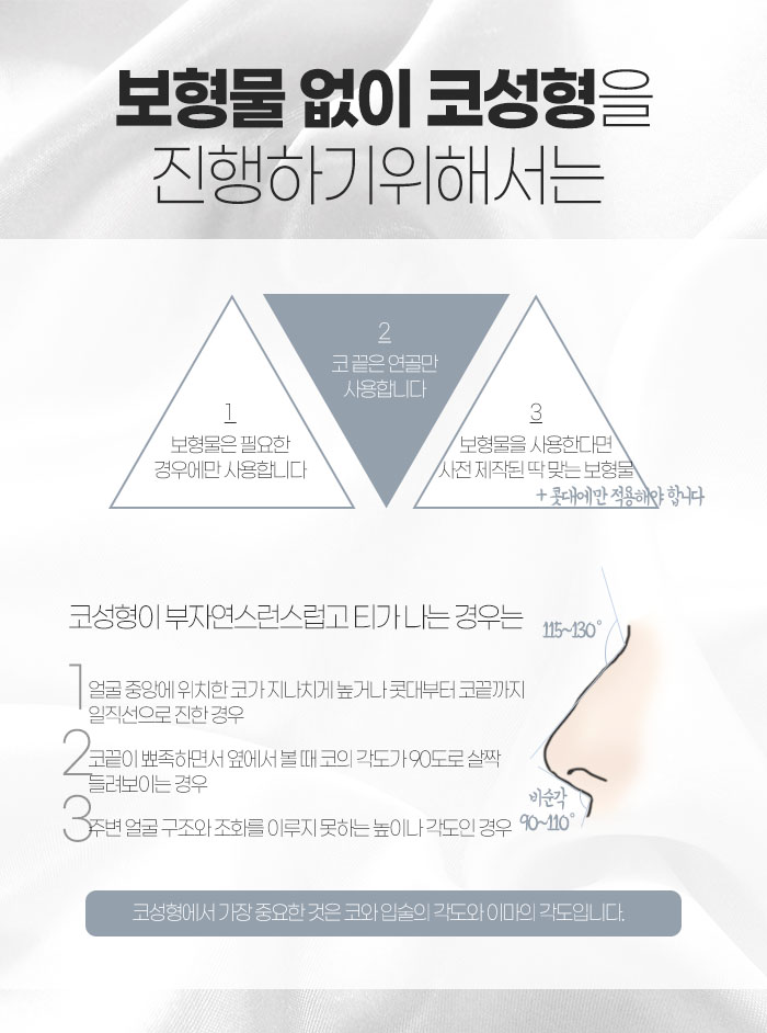 그리고 코끝 수술에 대해 말해보자면 우리나라 사람의 경우 콧볼의 연골을 모으는 것만으로는 충분한 코 높이를 얻지 못하는 경우가 많답니다. 그렇기에 코끝 연골이식으로 코끝의 높이를 더 높여주는 수술을 하는 것이 필요한데요.