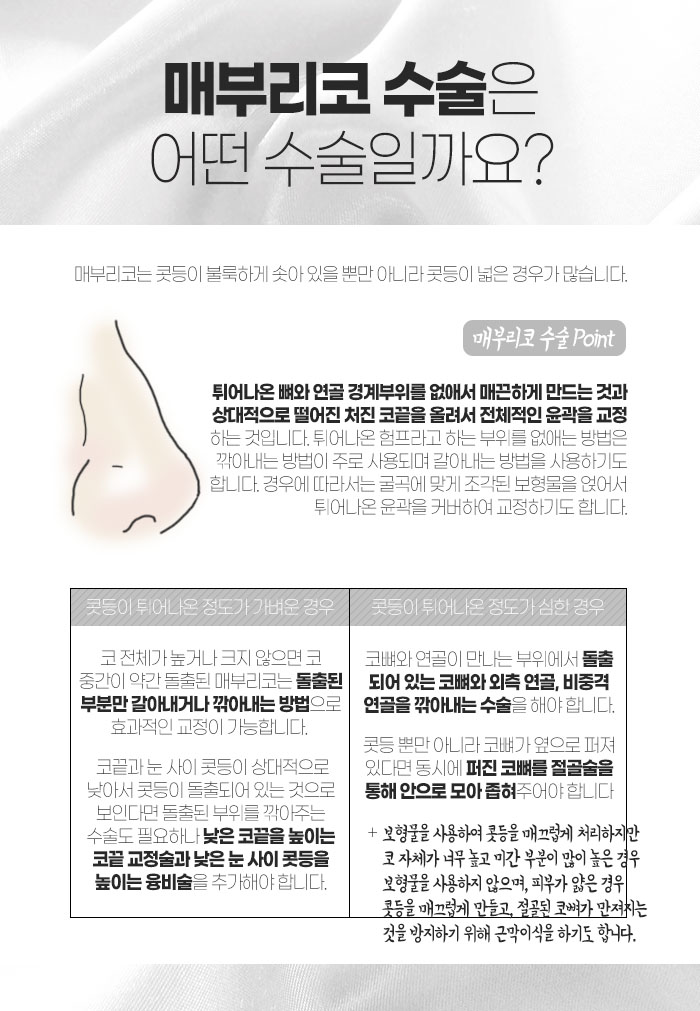 그리고 매부리가 재발해서 수원코성형 재수술을 받고자 하시는 분들이 적지 않은데요. 이러한 매부리코 수술은 튀어나온 뼈와 연골의 경계 부위를 없애서 매끈하게 만들고 상대적으로 떨어져 있는 처진 코 끝을 올려서 전체적인 윤곽을 교정하는데 도움을 주는 수술이랍니다.