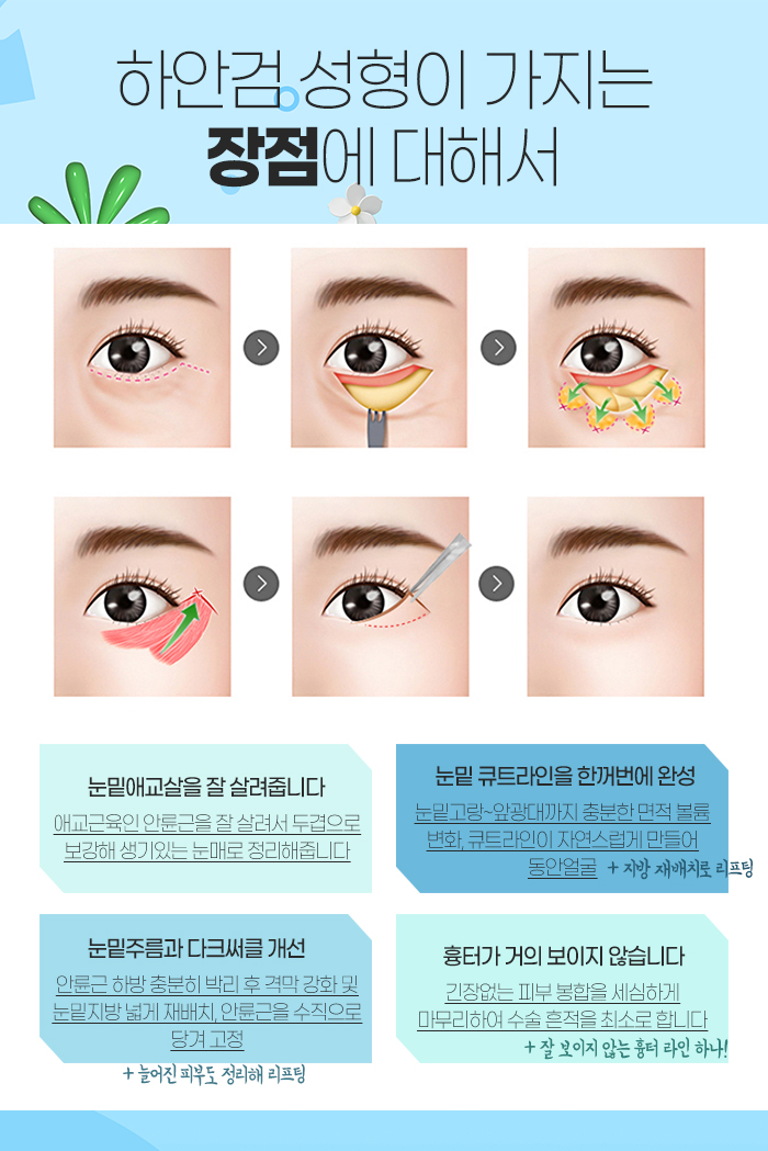 이러한 하안검수술은 흉터와 애교살 문제로 고민하시는 경우가 많은데요. 이는 수술을 하는 의료진의 실력에 따라 판가름이 난답니다. 애교살을 어떻게 잘 살리는 지에 따라 판가름이 나기 때문입니다.