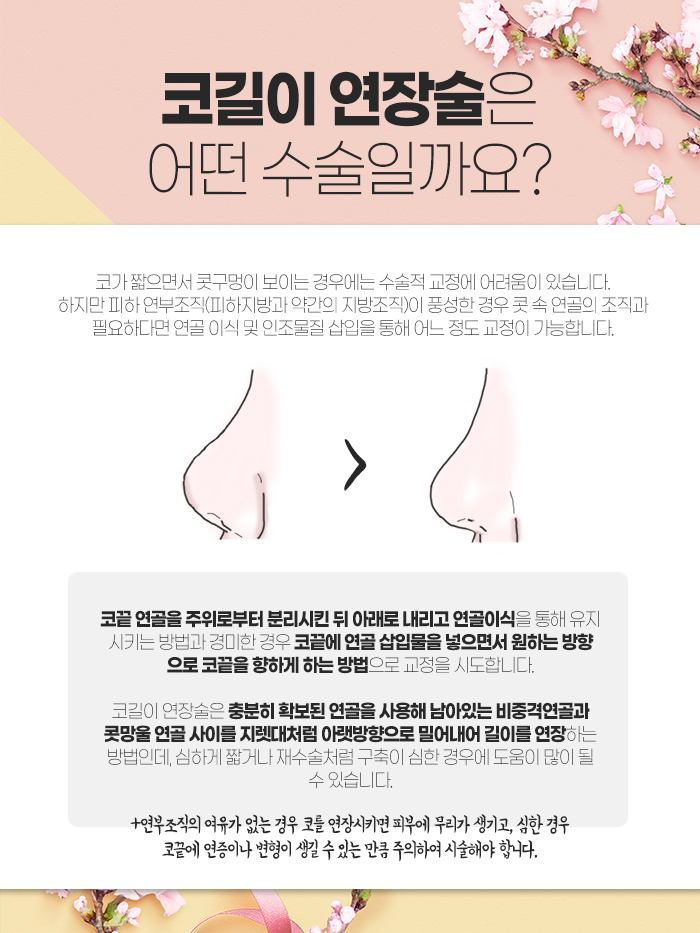 이렇게 코길이 연장술을 받게 되면 모양 면에서 자연스러운 각도가 연출되어 심미적으로 보다 나을 수 있지만 코 아랫부분은 신축성이 있어야 됩니다. 그런데 고정되어 단단해진 상태이다 보니 약간 부자연스러워 보일 수 있고 기능적으로도 불편할 수 있답니다. 그렇기에 코길이 연장술을 받는 것은 무조건 좋은 게 아닌데요. 얻는 것에 비해 코끝이 너무 딱딱해지는 기능적인 문제가 생기는 만큼 남발해서는 안 된답니다.