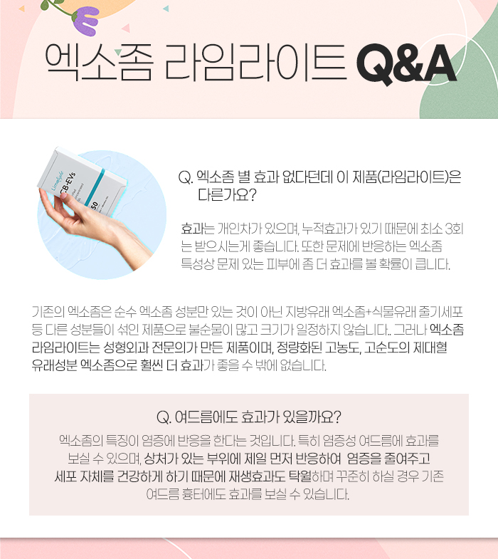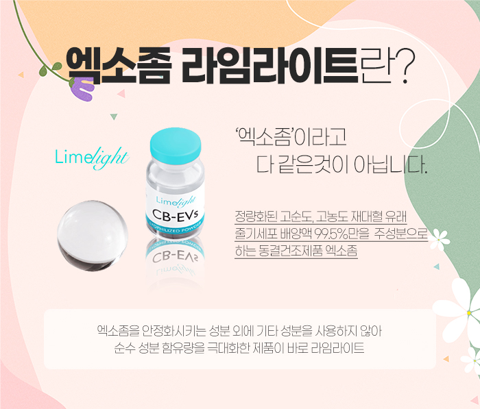 그리고 기존의 엑소좀은 순수 엑소좀 성분 외에도 지방유래 엑소좀과 식물유래 줄기세포 등 여러 성분이 섞여 있기 때문에 불순물이 많으며 크기가 일정하지 않았습니다. 하지만 라임라이트의 경우 성형외과 전담 의료진이 만든 제품인데다 정량화된 고농도, 고순도 제대혈 유래성분 엑소좀을 사용하고 있어서 훨씬 효과가 좋게 나타나는 것을 기대할 수 있답니다.