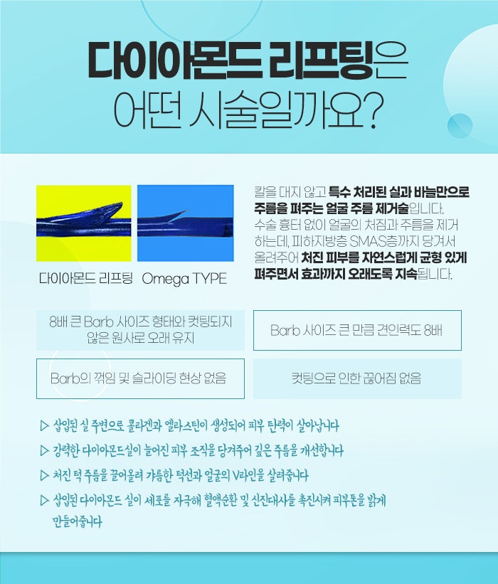 또 삽입된 실 주변으로 콜라겐과 엘라스틴이 생성되면서 피부 탄력이 살아나게 되는데요. 강력하게 다이아몬드 실이 강력하게 늘어진 피부 조직을 당겨주는 만큼 깊은 주름을 개선하는데 도움을 받아보실 수 있습니다.