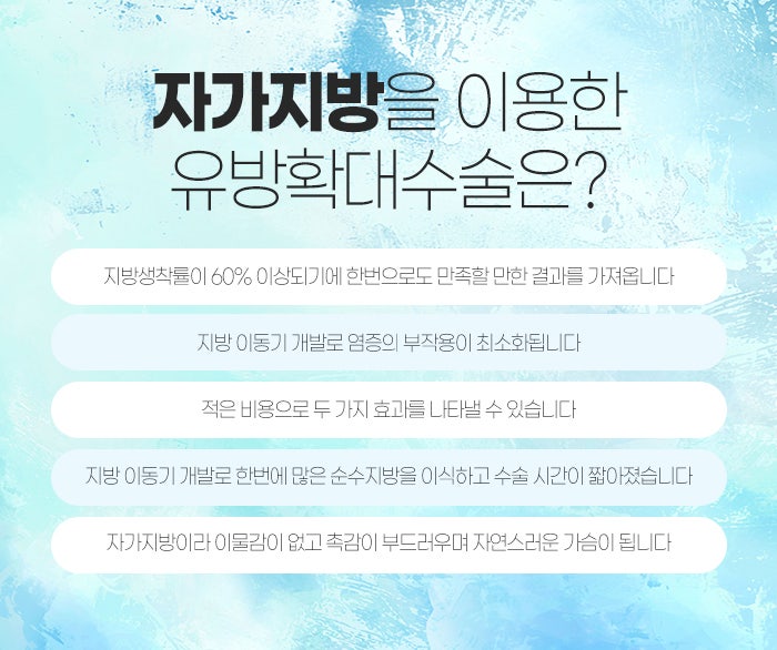 이 외에도 가슴 크기가 작아 고민하는 경우, 또 보형물이 아닌 자가지방을 이용하여 가슴의 크기를 키우고자 하는 경우에도 적합하게 도움을 받는 것이 가능하답니다.