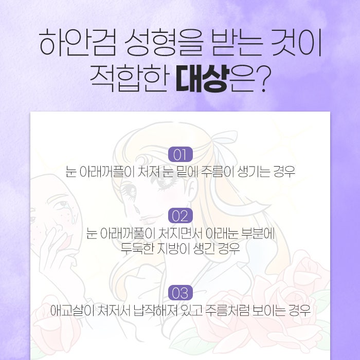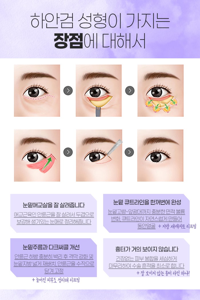 이는 성남하안검수술이 불룩한 지방을 눈밑고랑 아래로 재배치해서 개선하는데 도움을 주고, 늘어진 안륜근을 리프팅하여 애교살을 좁고 도톰하게 살려주는 것을 통해 인상을 생기있게 만드는데 도움을 주기 때문이랍니다.