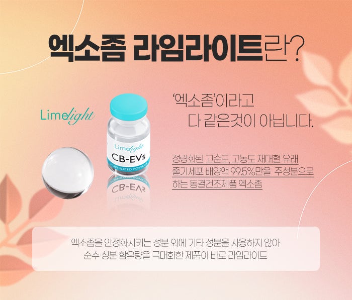 특히 엑소좀 중에서도 라임라이트로 도움을 받는 경우가 많답니다. 엑소좀이라고 다 같은 것이 아니기 때문입니다. 정량화 된 고순도, 고농도 제대혈 유래 줄기세포 배양액 99.5%만을 주성분으로 하고 있는데요. 나머지 0.5%는 엑소좀을 안정화시키는 성분이랍니다. 그래서 다른 엑소좀보다 더욱 기대를 할 수 있답니다.