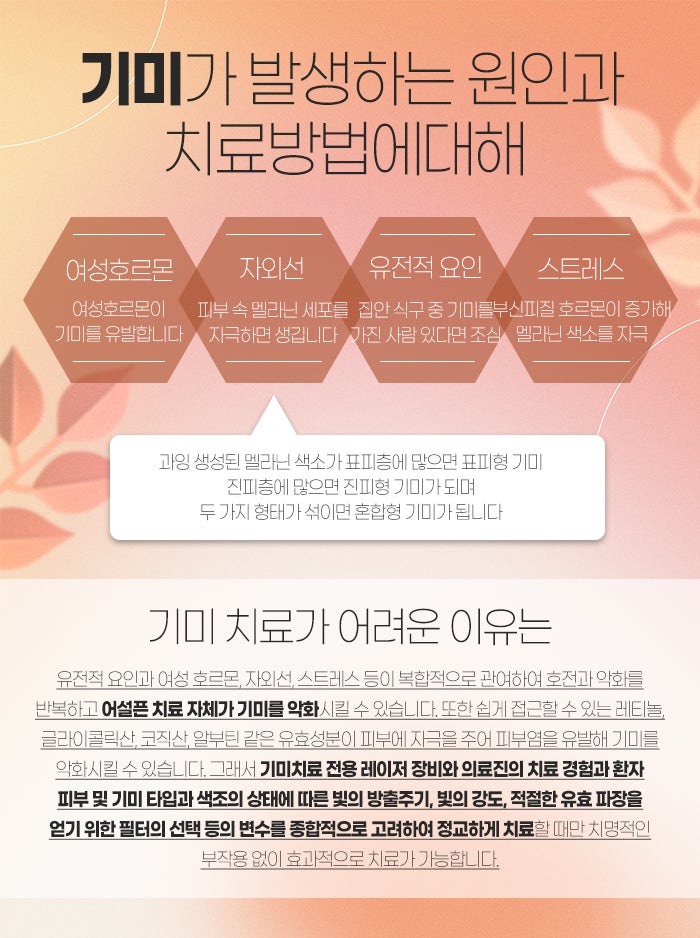 쉽게 접근할 수 잇는 레티놀이나 클라이콜릭산, 코직산, 알부틴 같은 유효성분이 든 화장품으로 관리를 해보시는 경우도 있지만 오히려 피부에 자극을 주면서 피부염을 유발하여 기미를 악화시키는 경우가 많습니다.