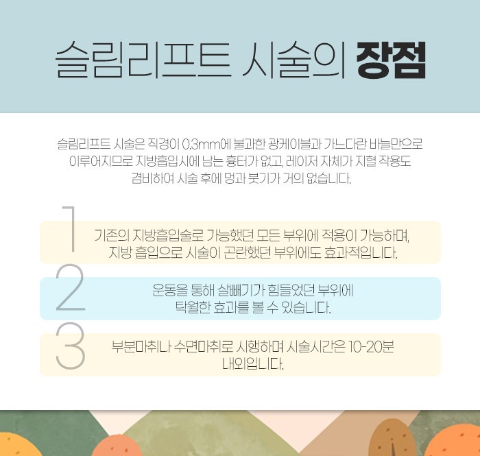 또 지방이 잘 깨지는 파장의 레이저를 사용하는 슬림리프트 지방성형이 있는데요. 바늘처럼 긴 끝에 레이저 빔이 나온답니다. 레이저 빔을 피부 지방 속에 삽입해서 지방을 깨트리거나 저항을 약하게 하여 부드럽게 빼내게 되는데요. 그래서 얼굴 부위나 팔, 종아리 등의 부위에 시술하게 됩니다.